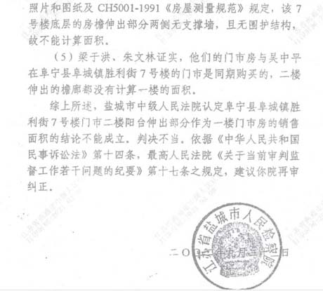 综上所述,盐城市中院对阜宁县胜利路7号楼1号门市二楼住宅伸出部分的檐廊的投影下没有围护结构,应该认定是社会公共通道(仅作门市房的雨蓬之用)纳入门市房的销售面积的结论不能成立,判决不当,两次驳回申请再审通知书的理由无任何法律、法规为依据,是错误的。根据《中华人民共和国民事诉讼法》第一百七十九条的规定,恳求对此案实施监督,以维护国家法律权威和当事人合法权益。请求依法按照江苏省实施《中华人民共和国消费者权益保护法》中第二十四条规定,判令被申诉人赔偿申诉人购房款加缩水面积房款、诉讼费、检测费。同时,由于被申诉人应用无法律效力的伪证报告欺骗两审法官导致此案判决不当,造成申诉人多年来上访取证所用差旅费、精神损失费等,亦应有被申诉人承担。
