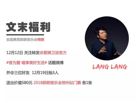 值得一提的是,@箭牌卫浴官方微博拟召集“郎朗音乐会锦鲤”,12月12日起,转发@箭牌卫浴官方#音为爱唱享美好生活#话题微博,并@三位好友,在12月19日将会抽出3位幸运儿,送出价值580元的2018郎朗音乐会郑州站门票各1张。