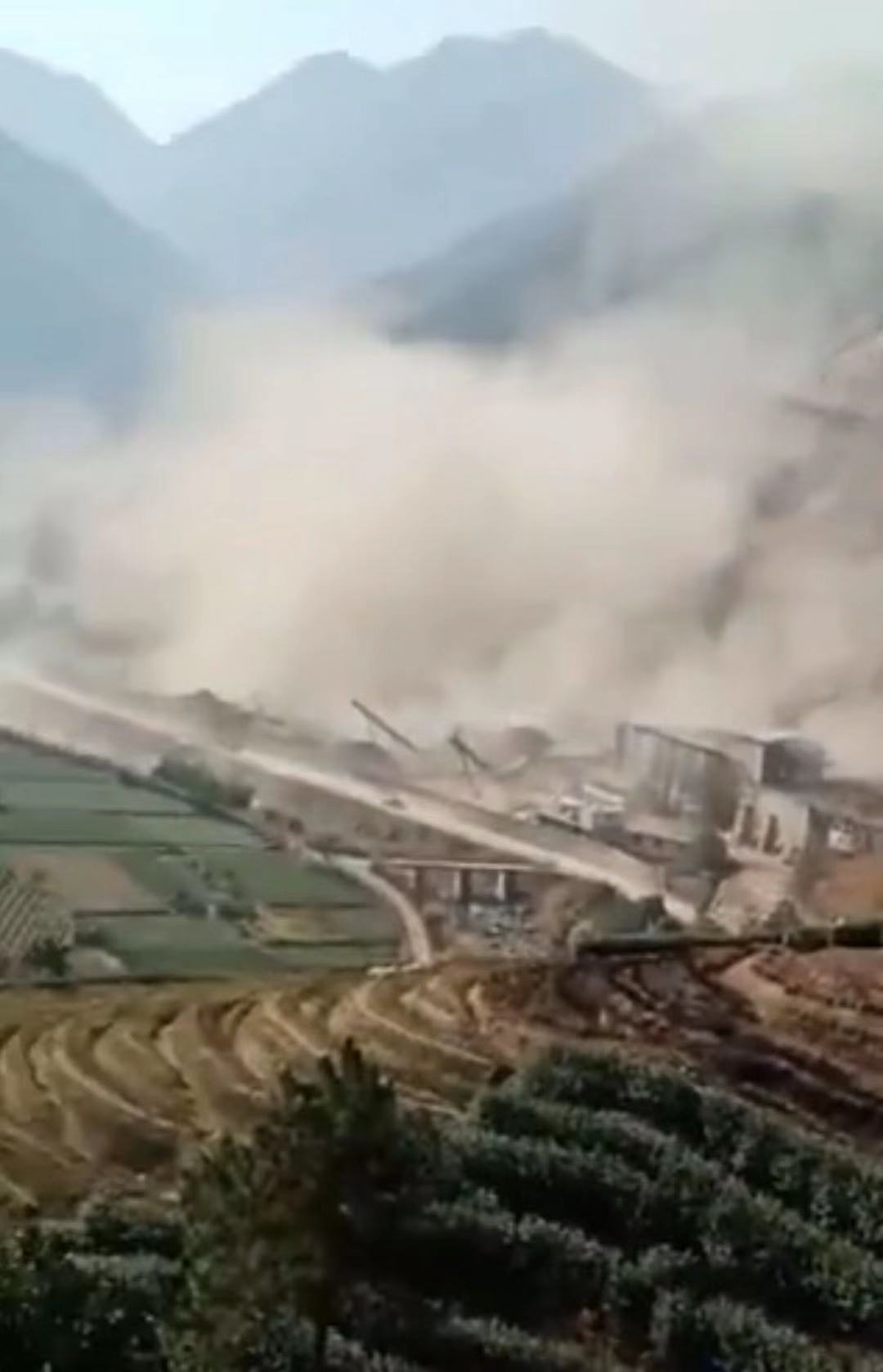 山体塌方瞬间产生大量灰尘。视频截图